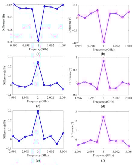 Magnitude and phase frequency response differences between the two strategies around 1 GHz (a,b), 2 GHz (c,d), and 3 GHz (e,f) for a nine-tone stimulus.