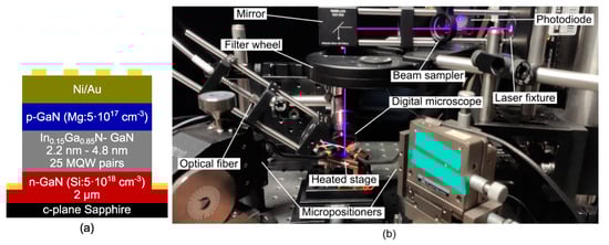 The samples under test are based on a p-GaN–i-In0.15Ga0.85N–n-GaN MQW structure, grown on c-plane sapphire by metal-organic chemical vapor deposition. Over the sapphire substrate, there is a 2 µm thick n-GaN (Si doping 5 × 1018 cm−3) layer, over which there is the MQW structure made by 25 periodical layer GaN (4.8 nm thick)–In0.15Ga0.85N (2.2 nm thick), topped with a 100 nm thick p-GaN (Mg doping 5 × 1017 cm−3) layer. The structure is schematized in Figure 1a. The approximate density of dislocation was derived to be 2.7 × 108 cm−2 and InGaN quantum wells were determined to be pseudomorphic grown on GaN layer with biaxial strain. Additional details on device structure can be found in previous reports [,]. The device under test is a 1 mm × 1 mm photodetector.