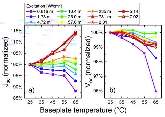 Short-circuit current density (a) and open-circuit voltage (b), both normalized at 25 °C, with respect to baseplate temperature at various excitation densities.