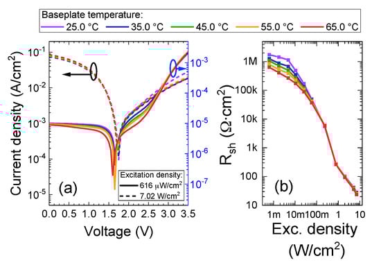 (a) I–V behavior at different baseplate temperatures with an excitation of 616 nW/cm2 (solid lines, right scale) and 7.02 W/cm2 (dashed lines, left scale) and (b) shunt resistance calculated from illuminated I–V characterizations.