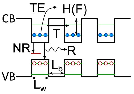 where is the overlap integral between electron and holes, gred is the reduced density of states and fc and fv are the conduction and valence band occupancy, respectively. Usually, this recombination has a lower impact since it is slower than tunneling and thermionic emission [], so carriers can easily escape before recombining radiatively.