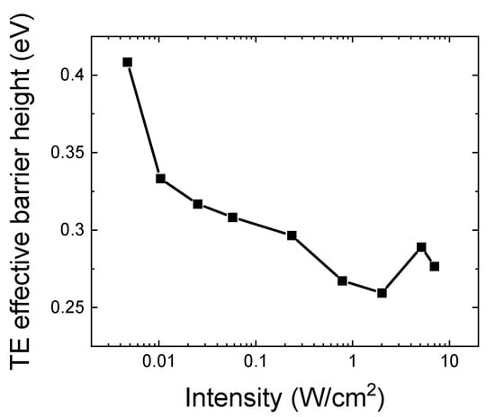 Having an estimation of the coefficients A(I) and B(I) and of the energy of the trap level for SRH recombination, we fitted the ΔJSC data with Equation (10), leaving Hi as the fitting parameter. By doing so, we obtained a rough estimation of the effective barrier height, which represents the average effective barrier height for electrons and holes in the 25 quantum wells. From Figure 9 it is possible to see that the effective barrier height needed to fit the experimental data decreases as intensity increases and its values are in agreement with the well depth previously calculated. We thus demonstrated that it is possible to describe the variation in the experimental JSC data with a model that takes into account SRH recombination and thermionic escape from the wells, the first lowering the short circuit current with increasing temperature, the latter increasing the short-circuit current.