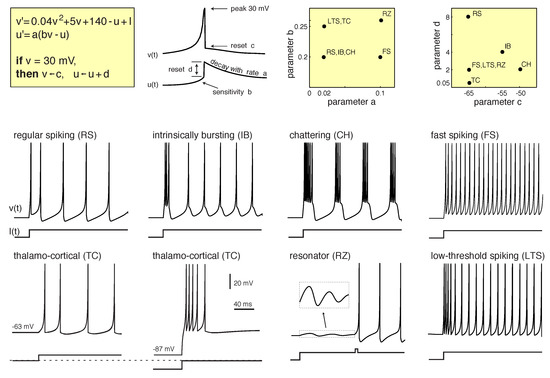 - Izhikevich, E.M. Simple Model of Spiking Neurons. IEEE Trans. Neural Netw. 2003, 14, 1569–1572. [Google Scholar] [CrossRef] [PubMed]