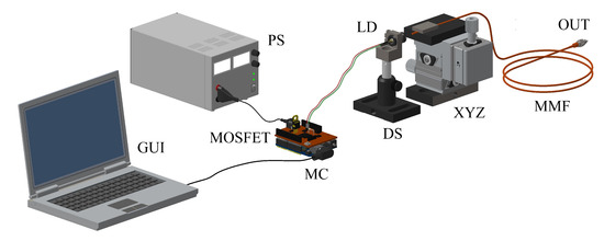 Experimental setup: graphical user interface (GUI), microcontroller (MC), power supply (PS), MOSFET transistor (MOSFET), CW laser diode (LD), diode support (DS), XYZ platform (XYZ), multimode fibre (MMF), laser output (OUT).