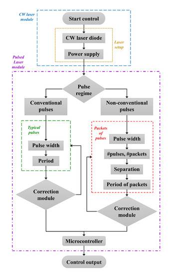 A flowchart describing the generation of pulses from the continuous emission of the laser diode is depicted in Figure 3. From the GUI and without the need to modify the experimental arrangement, the type of pulse is chosen: conventional pulses (reproducing the behaviour of mode-locked lasers) or packets of pulses of the same duration. In the first case, only the temporal pulse width and the period are defined. For the second option, in addition to defining the time duration of each pulse, the number of pulses per packet, the spacing between pulses and the period between packets are defined. This information is sent to the microcontroller, which is responsible of turning the laser diode off and on (with a minimum time response of 250 s, limited by the microcontroller’s clock), which is fed through a regulated power supply.