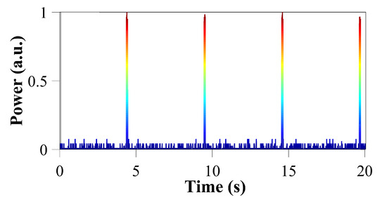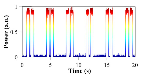 After demonstrating that our laser is able to produce periodic pulses and pulse packets, we established the appropriate parameters to produce asynchronous pulses, not periodic, with the intention of generating binary chains that can be interpreted as specific commands, as the central pattern generator does in the generation of walking patterns in humans and animals. This central pattern generator has also motivated the development of bio-inspired walking systems for robots [32]. Figure 7 shows two sets of asynchronous pulses, where each pulse has a duration of 70 ms an adequate time response for legged robots. Considering pulses as 1 and the laser off as 0, we have for set 1 the binary string: