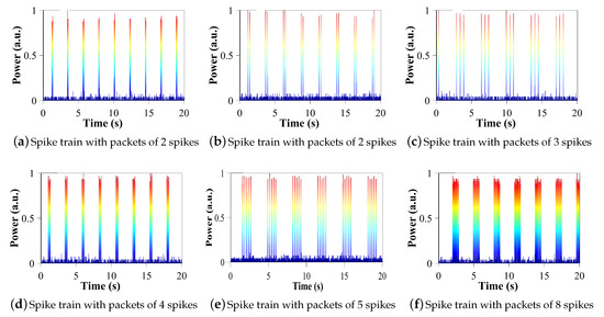 Focusing, for example, on Figure 5e, we observe a spike train with packets of five pulses, each with a duration of 10 ms per pulse, a spacing of 0.25 s between the pulses of each packet and a period of 3.3 s (between packets). This information can be found for each spike train of Figure 5 in Table 1.
