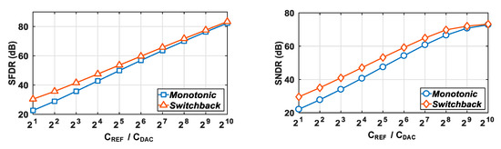 Despite the advantage of a low power implementation, the difficulty of using a CRD involves the signal-dependent error from charge rebalancing. To analyze the effect of the signal-dependent error of a CRD on a 12-bit SAR ADC, a behavioral simulation is performed for two popular low-energy switching schemes—the monotonic and switchback switching schemes [10,19]—and the dynamic performance comparison of the two switching schemes for various is shown in Figure 2. For the monotonic and switchback switching schemes, a doubling of improves the spurious-free dynamic range (SFDR) by about 7 dB and 6 dB, respectively. Due to the difference in switching energy, the switchback switching scheme always requires less compared to the monotonic switching scheme for the same signal-to-noise and distortion ratio (SNDR) and SFDR. For instance, a equal to achieves an SFDR of 65.8 dB and an SNDR of 64.9 dB for the switchback switching scheme, whereas the monotonic switching scheme attains an SFDR of 63.5 dB and 60.8 dB for the same . Therefore, the switchback switching scheme is utilized in our SAR ADC to reduce .