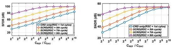 The parasitic capacitors on the outputs of the CDAC drivers should be minimized to prevent further voltage drop in the reference voltage. As the influence of this parasitic capacitor is shown along with the switching of the capacitors in the CDAC, such a voltage drop is also signal-dependent. Figure 14 shows the SFDR of a behavioral simulation for a 12-bit SAR ADC with CRD only, according to the total capacitance of parasitic capacitors ( = ). Each capacitance of the parasitic capacitors () is assumed to be , where is . For a equal to , the SFDR is degraded by 1 dB and 1.7 dB for of 0.3 and 0.5, respectively. In the switchback switching scheme with up–down transition, the draws the charge from only in the first conversion cycle that makes the upward switching transition in the reference connection. On the other hand, in the remaining conversion cycles, only a downward switching transition is used, which eliminates the interaction between and . Therefore, the proposed SCRD can remove the additional reference drop caused by the MSB parasitic capacitor for the RSC at the third cycle or higher.