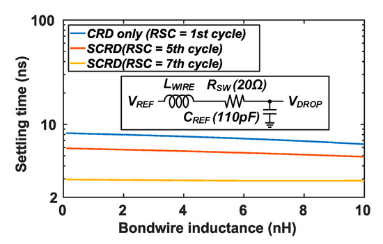 Settling time of the CRD from the worst signal-dependent voltage drop according to bondwire inductance ().