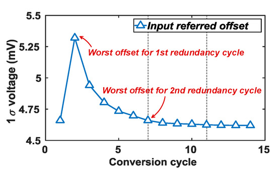An additional consideration of the switchback switching scheme is the comparator common-mode variation that causes dynamic offset. Although it can also be covered by a redundancy cycle similarly to the supply fluctuation, the requirement of the redundancy range increases. In order to estimate the redundancy range via the dynamic offset, Monte Carlo simulation is performed for various common-mode voltages in each conversion cycle, and the 1σ offsets of the dynamic comparator according to each conversion cycle are shown in Figure 10. Due to the up–down common mode voltage of the switchback switching scheme, the maximum 1σ offset is at the second conversion cycle, which has the highest common mode voltage. Considering 3σ offset as a worst case, the minimum required redundancy capacitance, , to cover the 3σ offset is as follows.