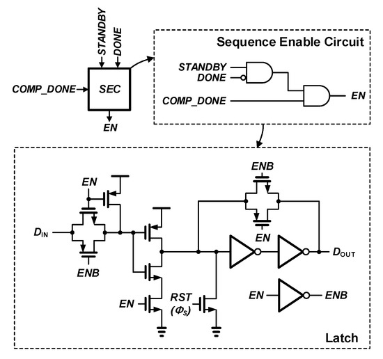 Figure 11 shows the block and timing diagram of the asynchronous SAR logic. After the sampling phase , activates the first sequence enable circuit (SEC), as shown in Figure 12. After the first comparison, COMP_DONE goes to high and acts as an enable signal (EN[0]) that activates a latch to transfer the comparator output to the CDAC driver. At the falling edge of COMP_DONE, the shift register transfers to SEQ[0], and activates the second SEC while stopping the first SEC. This sequence is repeated until the end of the conversion cycles. When STANDBY is high and DONE is low, each SEC passes COMP_DONE to EN with only one logic delay of the AND gate.