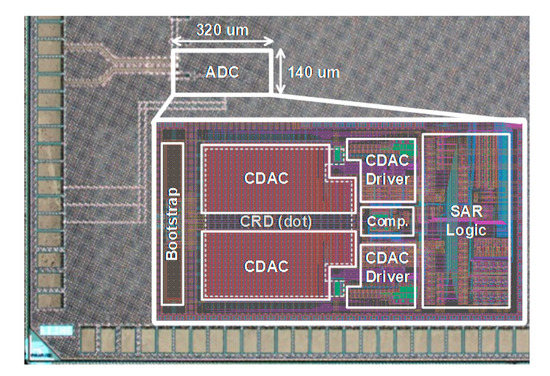 Figure 13 shows the layout of the CDAC. The unit capacitance of the CDAC is 0.4 fF, which leads to a total capacitance of about 850 fF, including two redundancy capacitors (25.6 Ff + 3.2 fF). The CDAC consists of a custom metal-oxide–metal (MOM) capacitor with an upper metal layer to minimize the parasitic capacitance from the substrate. The CRD is located under the CDAC to eliminate the additional chip area, and is implemented with MOS capacitors to maximize for the given area. The total capacitance of the CRD is 110 pF, which is about 27 times larger than .