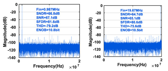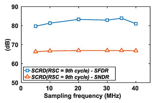Figure 17 shows the measured dynamic performance of the SAR ADC with an SCRD for a sampling frequency ranging from 5 MHz to 40 MHz. With the SCRD, the SAR ADC achieves at least an SFDR of 80 dB and an SNDR of 66.3 dB. The measured frequency spectra of the SAR ADC, with an SCRD using the input frequencies of nearly 0.987 MHz and 19.67 MHz, are shown in Figure 18. Even if the input frequency approaches the Nyquist frequency, the SNDR reduction is about 2 dB. At a near-Nyquist input frequency, the SFDR with the SCRD is 80.6 dB. Thus, from Figure 13, we can see that the SCRD improves the SFDR by about 16 dB compared to the CRD only, where the and are 0.3 and , respectively.