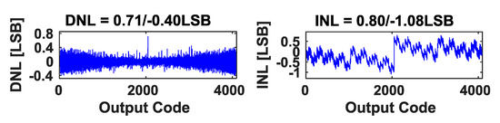 The signal-dependent error of the SCRD can be monitored by DNL and INL. With the SCRD, the measured maximum and minimum DNL and INL are 0.71/−0.4 LSB and 0.8/−1.08 LSB, respectively, as shown in Figure 19. The INL is limited to the capacitor mismatch of the CDAC, especially for an MSB capacitor. Except for the effect of the capacitor mismatch, the measured DNL plot has a trumpet shape because the degree of reference voltage drop in the CRD is largely changed with the input away from the mid-code. However, the DNL error caused by the reference voltage drop is less than 0.5/−0.5 LSB.