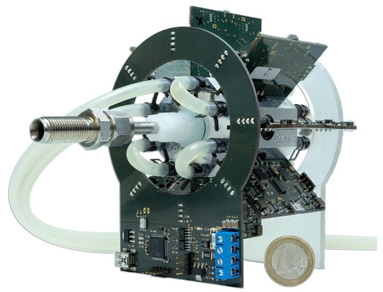As shown in Figure 1, the mainbord’s shape is a circle with an outer diameter of 96 mm and an inner diameter of 64 mm wrapping around a custom-designed, eight-sided measurement chamber. The eight sockets for the sensor modules are placed along a circular path with an angle of . A mirrored copy of the mainboard’s shape, created with a 3D printer, is used to affix the sensor modules on the backside of the system.