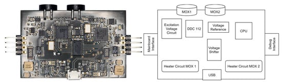 A sensor module implements the readout and heater circuit for two MOX sensors. A built prototype with a simplified block diagram that depicts the essential components is shown in Figure 2. The heater circuit is based on a well-tested design from a previous work [] built with the LTC3600 [] buck down converter in conjunction with the aforementioned LTC2945 and is therefore not further elaborated here. Communication and data transfer to the master, measurement operation, and temperature management is coordinated by a central STM32L433CC [] microcontroller. The wide-range resistive readout is realized with the DDC112 [] current-to-digital chip from Texas Instruments.