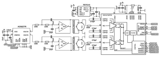 To provide the best flexibility and extensibility for future research, it was decided to implement a user-selectable sensor excitation voltage Vex for each sensor. It is generated by an external dual-channel 12-Bit digital-to-analog converter (DAC) type AD5627R []. Each of its two independent output channels is connected to an active second-order low-pass filter in Sallen-Key topology with a cutoff frequency of 5 Hz. The user can select voltages from 0.1 to 2.5 V with a 12-Bit amplitude resolution. The generated voltage is continuously read by the microcontroller’s internal ADC for regulation and self-diagnostic purposes. The AD5627’s internal high precision reference voltage is also used as an external voltage reference for the microcontroller’s analog circuitry. The excitation voltage circuit is depicted on the left side of Figure 3.