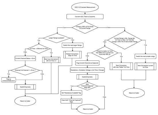 The measurement algorithm is presented in the flowcharts in Figure 4 and Figure 5. The system is initiated with the highest internal integration range (350 pC) and maximal integration time (100 ms). The continuous measurement is started by configuring the range (three GPIO lines representing a Bit pattern from 0–7), and then the first measurement is triggered by providing the integration signal (CONV) to the DDC112. It is generated by a 32-Bit timer of the microcontroller, operating in PWM (Pulse Width Modulation) mode. It produces a square wave with a fixed duty cycle of 50%, and its frequency is equal to half of the desired integration time. The PWM frequency change is encapsulated in a non-blocking subroutine called Start Measurement, which takes the desired integration time as a parameter.