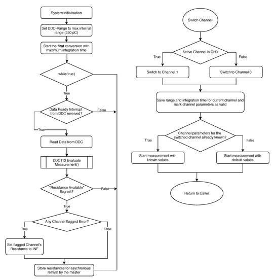 Following the return of the channel switching subroutine, the program checks if both channels have been captured. If this is the case, the global “Resistance Available” flag is set. If both channels have not been captured yet, the subroutine ends and returns to the main loop, where the status of the “Resistance Available” flag is checked, and, depending on its state, the new values are prepared for asynchronous transmission to the master. Following that, a new measurement is always started and the cycle begins again.
