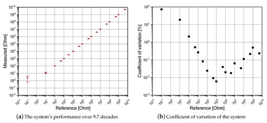 Figure 6 depicts the results from the accuracy measurement, as well as the coefficient of variation over the 9.6 decades. Figure 6b shows that the system is most error-prone in the lower two decades. The reason for this is the very short integration time and the use of the external capacitors (270 pF ± 2% Type AVX Corporation 06035A271GAT2A), which were used to measure the small resistors. As mentioned above, the external capacitors can have large deviations in their absolute capacitance, and their position outside the IC package makes them more sensitive to external influences such as temperature or electromagnetic interference. Since the system was initially designed to cover the range from 100  upwards, these low ranges are not that important for the application and are only listed here for the means of presenting a more complete overview of the performance of the system. The system’s average coefficient of variance over the complete range (0  to 4 G) is 5.41%. For the initially defined range (100  to 4 G), the system reaches an average accuracy of 0.27%.