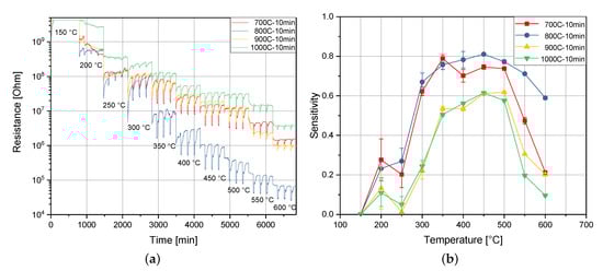 Restive changes of the sensors during the measurement program (a) and temperature dependency of the sensor sensitivity depending on the sintering temperature, all with a fixed sintering time of 10 min (b). The sensor name is the combination of the sintering temperature  and respective holding time. The temperature information in (a) shows the working temperature of the sensors. All experiments were performed in synthetic air. Acetone was used as the test gas and diluted to 5 ppm with synthetic air while maintaining a total flow of 200 sccm.