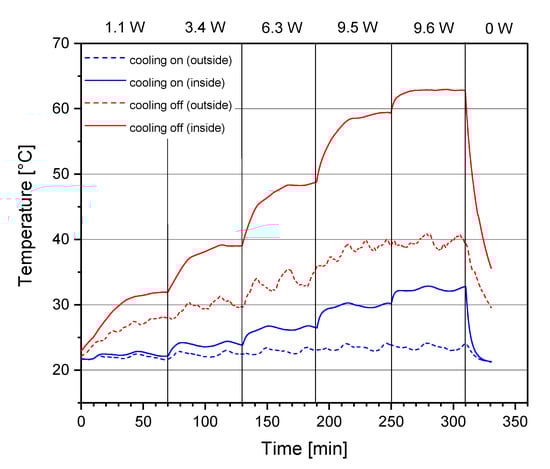 The principle functionality of the water cooling was also evaluated in a separate experiment. The water cooling system was installed to reduce the heat in the aluminum of the measurement chamber, because, in an earlier version of the system, a noticeable influence between the temperature of the chamber and the measurement accuracy (especially when using the external integration capacitors) could be observed. The results for the tests of the water cooling are depicted in Figure 9. The columns of the plot represent the heating power summarized over all the 16 sensors. The column with the heating power of 9.6 W resembles the power for the sensors during the screening process described in the work. Using the water cooling, the temperatures on the surface as well as on the inside of the chamber could be reduced to such a degree that the chamber temperature no longer influences the measurements.
