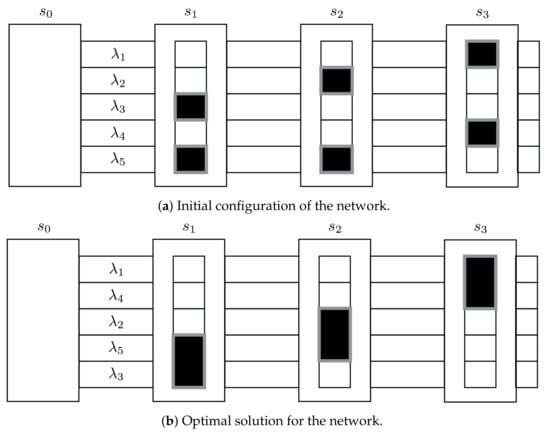 Figure 1a depicts the initial configuration of the network, where the wavelengths have been included in lexicographical order (i.e., from to ). The wavelengths that have been grouped in the same card are highlighted with a thick grey border (with length ). Then, the initial cost of the network is evaluated as .