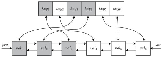 The structure depicted in the upper side of the figure represents the table where keys are stored. Similarly, in the lower side a double linked list is depicted, which stores the values in ascending order with respect to the last time it was accessed. In particular, in this example the keys , and are linked with the corresponding entries, i.e., , , and . For the sake of clarity, we have highlighted in grey these pairs of keys and values. Notice that, using the appropriate data structures, the complexity of inserting and deleting a new element in the table is .