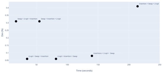 The aim of the third experiment is to find the optimal ordering of the neighborhood structures in the context of VND. Although it is usually recommended to firstly explore the neighborhoods from the smallest to the largest [34], we perform an empirical evaluation of all possibilities in order to select the best one. In this experiment, each variant of VND has been applied to the solution derived from . Figure 3 shows a graph comparing computing time (X-axis) with average deviation (Y-axis) of the six possibilities for the local search order within VND.