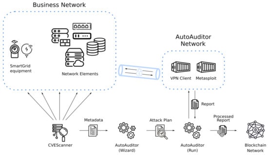 autoauditor workflow is illustrated in Figure 1. It starts with an auxiliary tool CVEScanner [34] and the list of metadata about potential vulnerabilities in the database, including available metasploit modules. The list is saved in the JSON format and the expert supervises and configures the attack plan, which is then encapsulated for execution. The configuration also comprises the VPN connection including addresses and credentials. autoauditor outputs the composition of the containers including the connection and audit application. The composition is then manually instantiated the first time so that the expert can verify its correctness. After potential corrections are made, the company launches the automatic deployment and execution of as many instances as required for the equipment under test (EUT). Finally, the results are collected, processed, and stored in the blockchain.