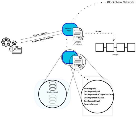 autoauditor implements storage of reports in a HLF network. The version of HLF of this prototype is 2.1.1. We have developed a smart contract (chaincode as coined in HLF) compatible with autoauditor, allowing audits reports storage and query by some given identities. This different access is programmed by defining two different collections, which makes possible to protect private data and to keep the secrecy of specific types of audit reports. In the blockchain-based AAAA system of autoauditor, these two collections have been defined: