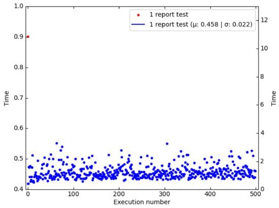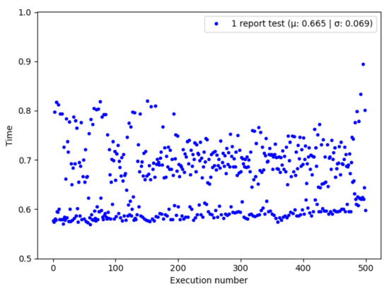 Figure 4 shows the time spent querying a single report with GetReportById() in multiple executions. Querying a single report spent 0.665 s in average with a standard deviation of 0.069.
