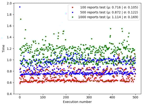 The study was executed in a processor Intel i7-8565U (8) @ 4.600 GHz and was divided in three experiments. The first one studied the performance with 100 reports stored in the blockchain, second and third ones had 500 and 1000 reports stored, respectively.