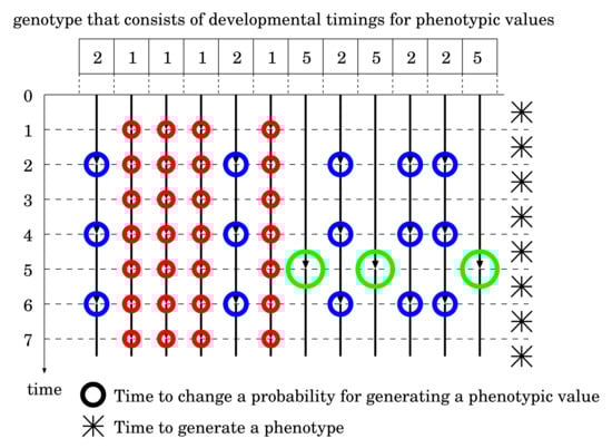 As mentioned in the previous section, an individual within a generation has a lifespan and consists of a genotype and a vector of probabilities. A time in a lifetime of an individual is denoted by , where N is the algorithm parameter representing the end of the life of the individual. In addition, let and be the genotype and the vector of probabilities, respectively, where is an integer number within and is a real number within . is the algorithm parameter representing the possible maximum cycle time. The genotype does not vary during the lifetime of the individual, but the vector of probabilities varies during its lifetime. In this section, we explain how the vector of probabilities varies due to the developmental timings composing the genotype and how N phenotypes are time-sequentially produced from the genotype and the vector of probabilities. An overview of the individual development is shown in Figure 1.
