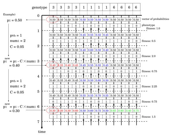 The modification of the elements of the vector of probabilities is performed as follows. Suppose that the i-th gene is . The modification of the i-th element of the vector of probabilities, , is carried out every time step during the development of the individual. When the time is , where a is an integer number, the modification is performed using the phenotypes generated within to and their fitness values. For example, when is 2, if the phenotypic values at the i-th position in the phenotypes generated between time of one and time of two are 1 and 0, and if the phenotypic value at the i-th position in the phenotype with the best fitness value among these two values, , is 0, then the probability with which 0 is generated on the i-th position in the phenotype, , increases in proportion to the number of 0s in the two phenotypic values generated, . If is 1, then decreases in proportion to the number of 1, . The new probability, , is determined by Equation (1).