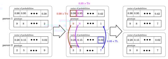 Before applying the crossover operator, the EDT does not conduct selection for reproduction but just randomly divides all individuals of the present population into pairs thoroughly. When the population size is P, the number of the parent pairs is , where P is an even number. Each pair of parent individuals produces two new individuals, so that the total number of individuals produced is P. The condition in which the i-th gene of a parent individual of focus, , is copied onto the genotype of another parent individual is that the i-th element value of the vector of probabilities of the parent individual of focus, , satisfies or , where and are the algorithm parameters. An application example of the crossover is shown in Figure 3.