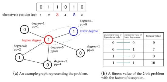 In addition, in our most recent paper [], in order to improve the mutation-based EA, we proposed a new EA by adding a crossover operator to the mutation-based EA. We referred to this EA as the evolutionary algorithm evolving developmental timings (EDT). Then, we devised a new test problem that conventional EAs, such as the population-based incremental learning (PBIL) [] and the compact genetic algorithm (cGA) [], are likely to fail in solving and for which features of the proposed EA are well utilized. The test problem consists of multiple two-bit functions with a factor of deception, among which there is hierarchical dependency, and has a feature that the hierarchical dependency is represented by a graph structure. We applied the EDT and the conventional EAs for comparison, the PBIL and the cGA, to the new test problem and showed the usefulness of the evolution of developmental timing.