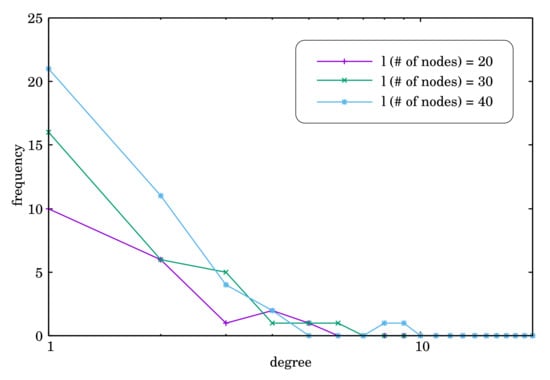 The degree distributions of three graphs used in the HDEP. The numbers of nodes in the three graphs, which are equivalent to the problem size, ℓ, are 20, 30, and 40. They are all power-law distribution.