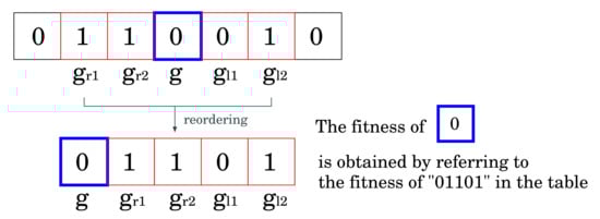 The fitness of g in the sequential five bits, (, , , , ), in NKL-K4. The five-bit string in the table represents (, , , , ).
