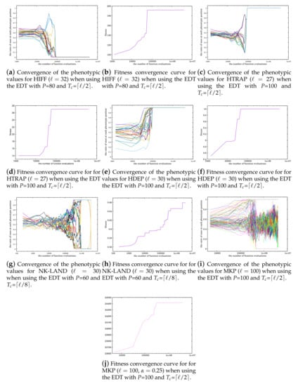 Similar to MKP, NKL-K4 also have multiple linkages overlapped and the optimal values for the linkages can be different. However, in NKL-K4, a linkage consists of five variables and the maximum number of variables overlapped in two linkages is four. The size of the linkage is quite significantly smaller than MKP’s. Therefore, NKL-K4 seems to be easier for the EDT than MKP. To understand how the EDT actually solves NKL-K4, we look at the results of NKL-K4, shown in Figure 7g,h. Then, we can observe that the EDT converges values of the variables partially sequentially by the middle phase of the search and then takes a long time to find optimal values for very few variables. The average number of evaluations required for a successful search, shown in Table 5, also supports this observation. That is to say, we can see that the global optimum is found at the number of evaluations close to the maximum number allowed.