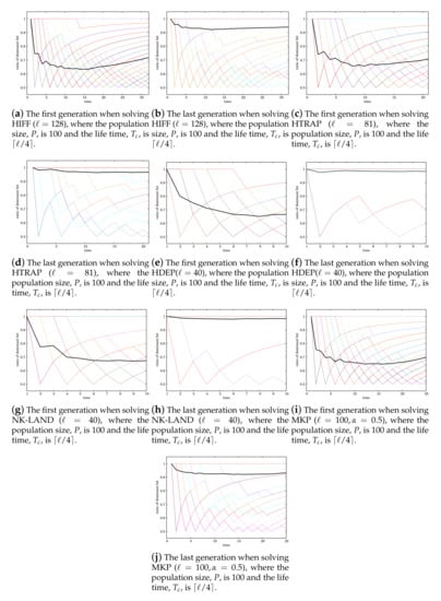 The characteristics of the EDT confirmed above must be suitable for solving MKP. To understand how the EDT actually solves MKP, we look at the results of MKP shown in Figure 7i,j. Then, we can observe that values of the variables converge partially sequentially until the time at which the global optimum is found. However, after finding the global optimum, some variables’ values do not converge but keep fluctuating. One of the reasons for that would be that infeasible solution candidates are repaired to feasible ones this time. That is to say, multiple infeasible solution candidates with different values for a few variables can be repaired to the same solution candidate, so that the target variables for repair would never converge.