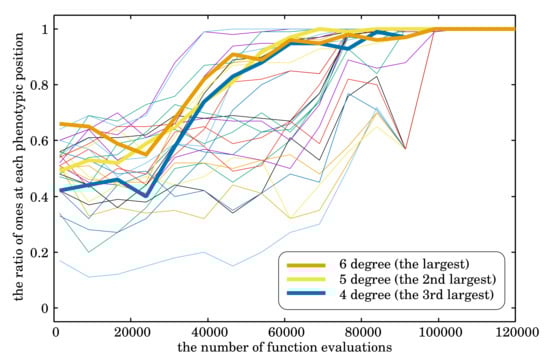 As we revealed in our previous studies [,], the EDT partially sequentially decides values of variables even for uniform-scaled problem. That is to say, the EDT brings different evolution speeds to variables of a problem. So, we first confirm if the EDT exposes the characteristics to the problems used in the paper. Figure 7 shows the time-variation of the ratio of 1 for each variable and the convergence curves of fitness values. Note that the horizontal axis representing the number of fitness evaluations is log-scaled.