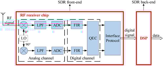 Compared with superheterodyne receivers, zero-IF receivers have become the main SDR radio frequency (RF) front-end receivers due to their simple structure, high integration, small size, low cost and low power consumption [3]. As shown in the Figure 2, the SDR system can be divided into SDR front-end and SDR back-end. The front-end is mainly composed of a RF analog channel, a digital-to-analog converter (ADC) module and a digital channel, and the back-end is mainly composed of a baseband module to process baseband signals. Between the analog channel and the baseband module of the zero-IF receiver, the digital channel generally includes a filter, IQ calibration and other sub-modules. The digital channel and baseband module are connected through an interface protocol to transmit signals in different clock domains. The digital channel is the core part of the software radio system. It is necessary to design a reasonable digital channel to ensure compatibility, efficiency and scalability of the SDR system.