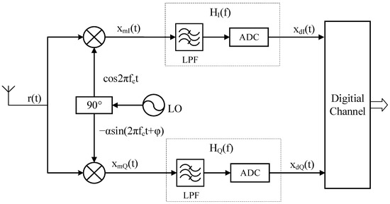 The I/Q mismatch in the wideband zero-IF receiver is caused by two different sources: (1) the amplitude imbalance and phase error of the local oscillator (LO) signals of the quadrature mixer are commonly considered to be frequency-independent for a certain LO frequency [6,7,8]. (2) The frequency-dependent imbalances may include contributions from the ADCs and the low-pass filters (LPFs), as well as the signal paths themselves [9]. For a wideband received signal, the dispersion of the frequency response of the analog devices within a zero-IF receiver usually cannot be ignored. Therefore, both types of imbalance in the calibration scheme of the wideband zero-IF receiver have to be considered.