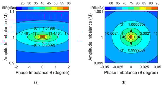 A simulation is carried out based on the theoretical analysis, with the results shown in Figure 4. The imbalance will be affected drastically with the increasing of the phase deviation or the amplitude imbalance. From the results shown in Figure 4a, when |θ| is less than 1° and |M − 1| is less than 0.0198, the IRR is greater than 40 dBc. As shown in the detailed zoom-in view of Figure 4b, when |θ| is less than 0.002° and |M − 1| is less than 3.5 × 10−5, the IRR reaches 95 dBc. Therefore, a high IRR requires high accuracy in estimating imbalance parameters.
