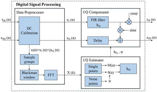 The detailed logic block diagram of the IQ imbalance calibration model algorithm designed in this section is shown in Figure 7.