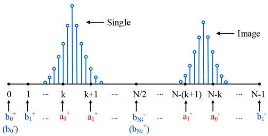 The entire baseband of a zero-IF receiver contains frequency-independent imbalances, and the noise within the operating frequency range of the communication system is generally white Gaussian noise, which satisfies E{|X(k)|2} − E{|X(N − k)|2} ≈ 0 in Equation (9). In addition, it is meaningless to estimate M(k) and θ(k) at all calibration points (0 to N−1) by using Equation (8) and Equation (9), because the noise contains almost no information about frequency-dependent imbalances. Therefore, as shown in Figure 6, we divide N calibration points into signal points and noise points. The imbalance parameter φ is calculated by the noise points, M(k) and θ(k) are calculated by the signal points. Due to spectrum leakage, the amplitude value of the calibration points near the signal is relatively large. Based on the above analysis, the following provisions are made for the classification of calibration points: