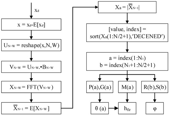 In Figure 7, the input complex signal data is xd = [xd(1), xd(2), …, xd(K)]T. The function reshape(x,N,W) represents the transformation of the column vector x into an N × W matrix, and B is an N × W window coefficient matrix. The function sort() means to sort the data in descending order, where value is the new sequence after sorting, and index is the index of the item in the new sequence corresponding to the original sequence.