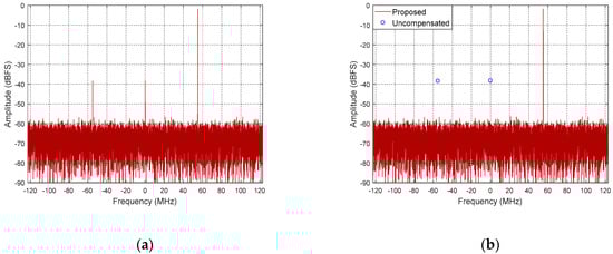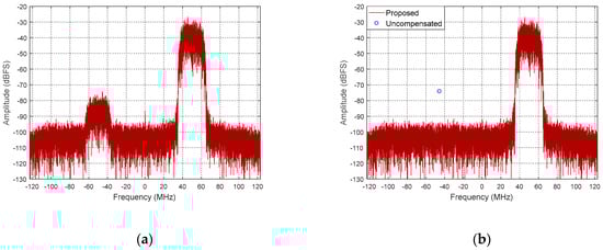 Figure 12 and Figure 13 exhibit the amplitude spectrum of the multi-tone and the wideband signals before and after imbalance compensation, respectively. The average IRR of the multi-tone signal before compensation is 52.2 dBc, and the average IRR after compensation is 81.6 dBc (with 29.4 dB improvement). The wideband signal has the largest amplitude at 45.6 MHz before compensation, its IRR is 48.7 dBc, and the IRR after compensation at this frequency is 75.9 dBc (with 27.2 dB improvement). The above experimental results show good calibration effect of the proposed I/Q imbalance calibration model on both multi-tone and wideband signals.